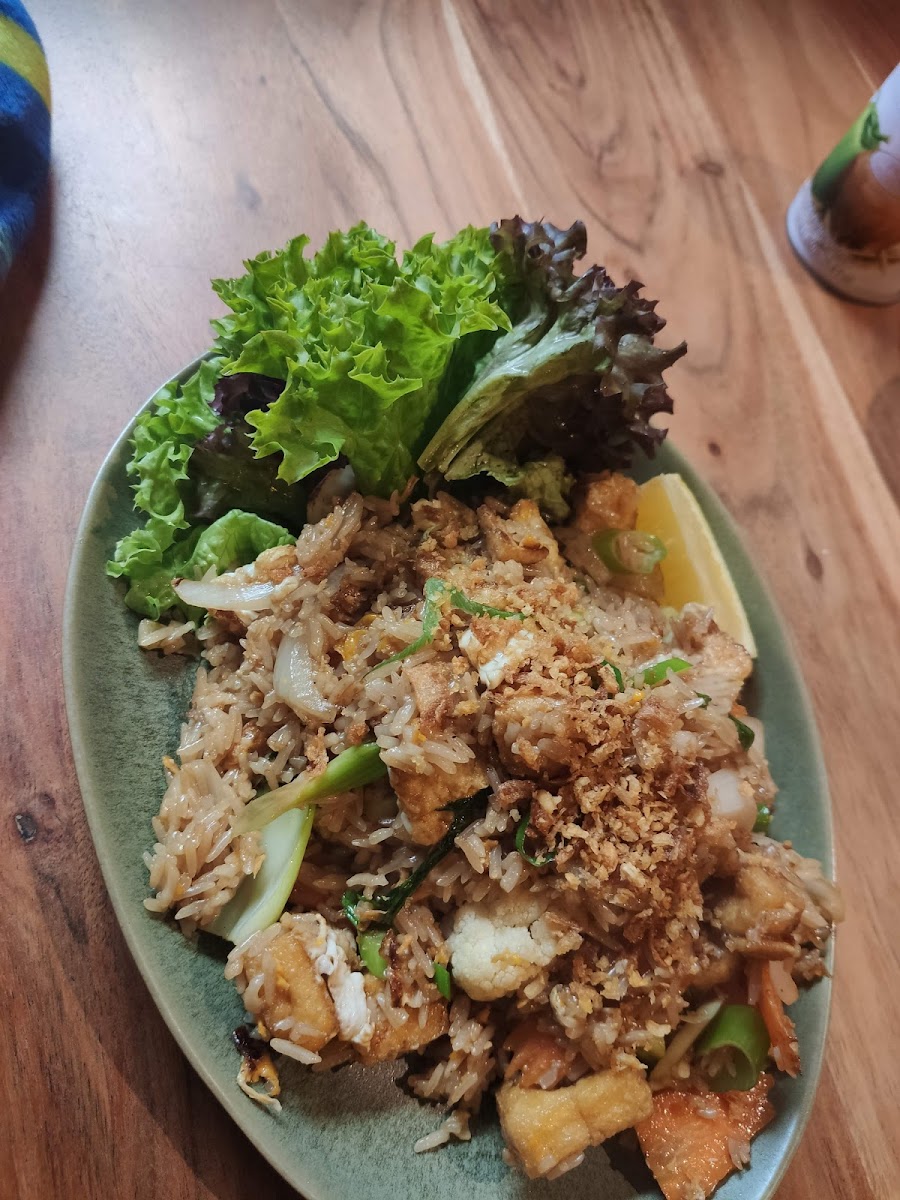 Had the dish with ginger and tofu. The sauce, rice and veggies tasted rich and fresh. Ginger was well balanced, loved it! Veggies had a nice bite. Would have prefered more green veggies (it had lots of carrots in it). Tofu was fried, spongy and therefor less tasteful. But all together, also considering the (low) price and the super nice staff, definitely recommend.